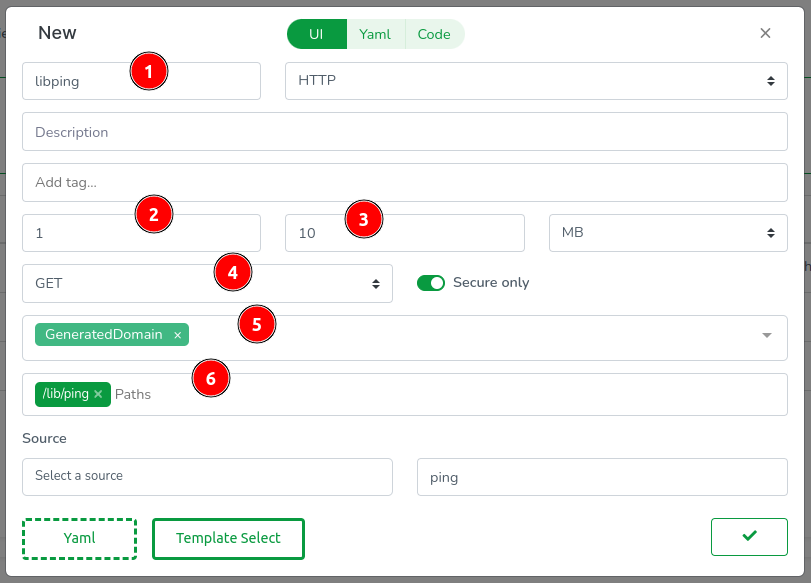 Navigate to the Functions tab on the left sidebar. Then click on + to create a new function. Name it, set the timout to 1 second, the memory limnit to 10MB, the method to GET, the domain to GeneratedDomain and the path to /lib/ping.